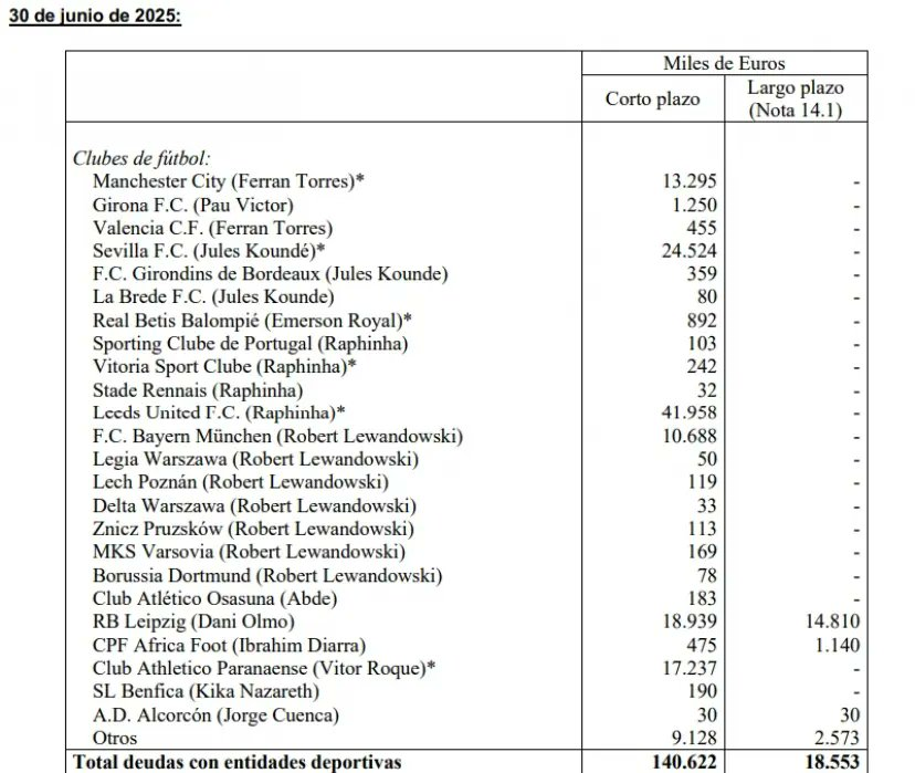 最大苦主,列斯聯 (?): 為咗夏芬拿(Raphinha),巴塞仲爭緊人哋成 €4,200萬。 第二大債主,西維爾: 為咗觀迪(Koundé),仲等緊巴塞找 €2,450萬 條數。